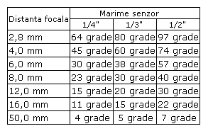 CORESPONDENTA INTRE MARIMEA LENTILEI , MARIMEA SENZORULUI DETERMINA UNGHIUL DE VIZUALIZARE A CAMEREI DE SUPRAVEGHERE ASTFEL: